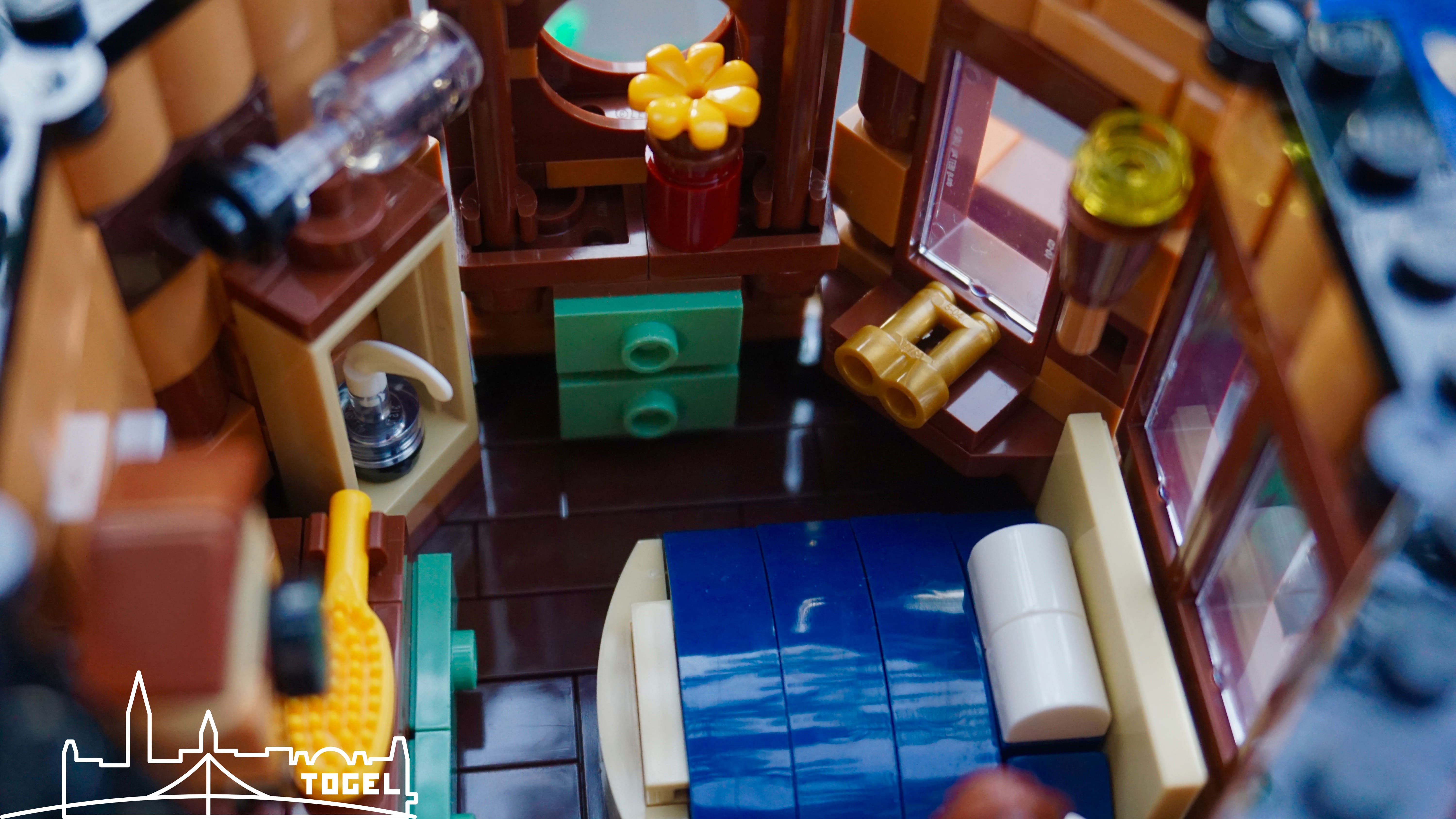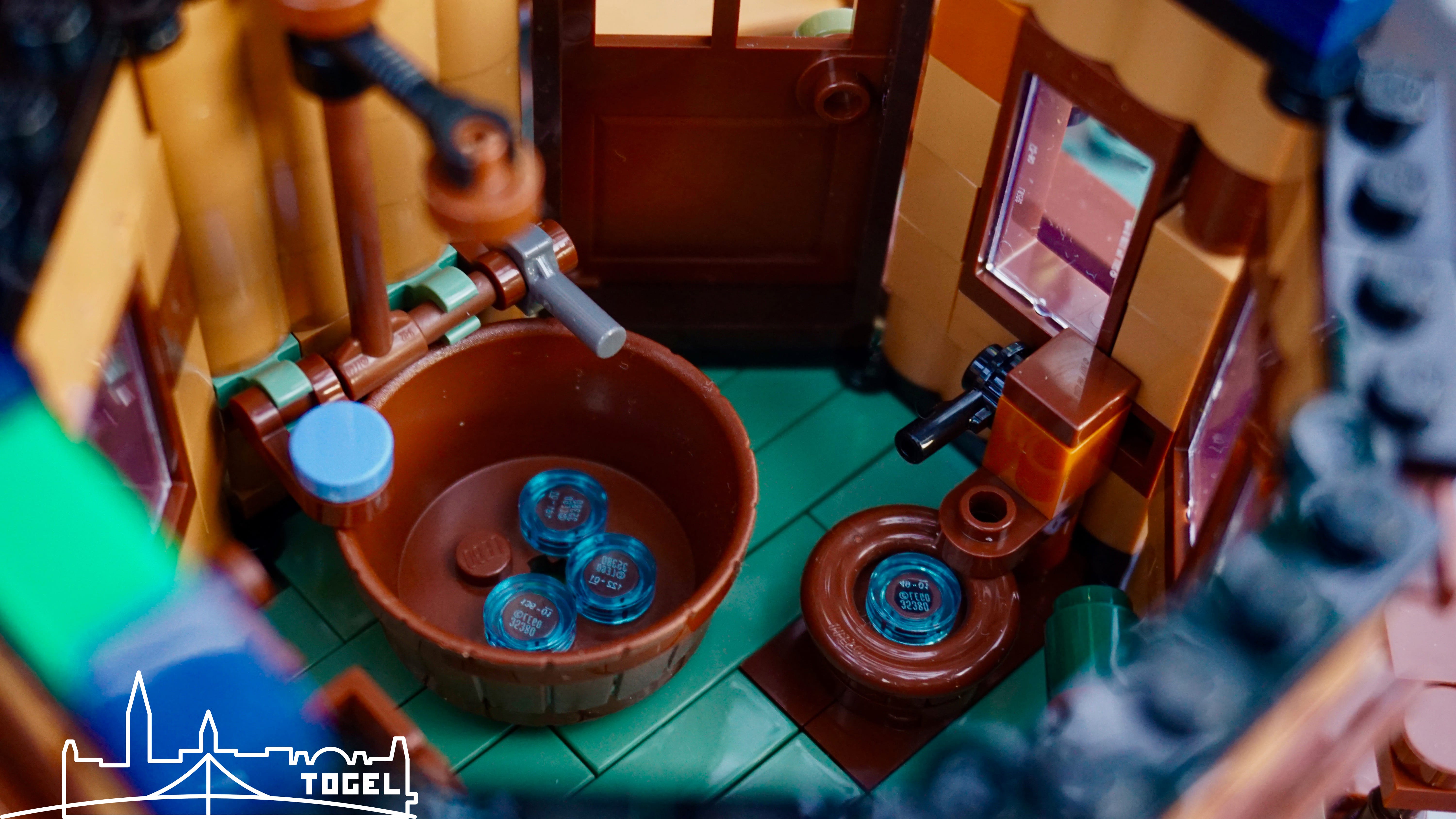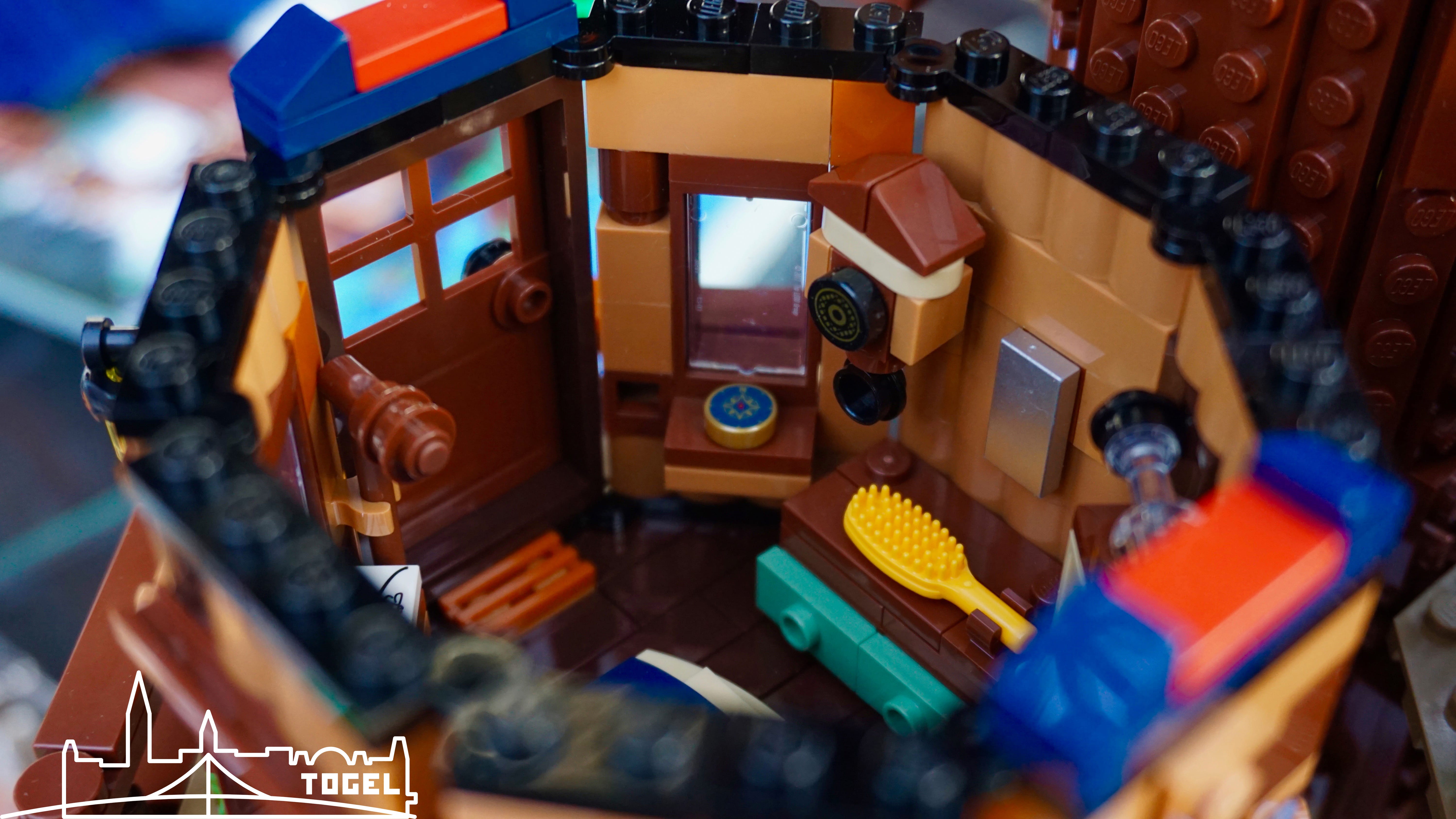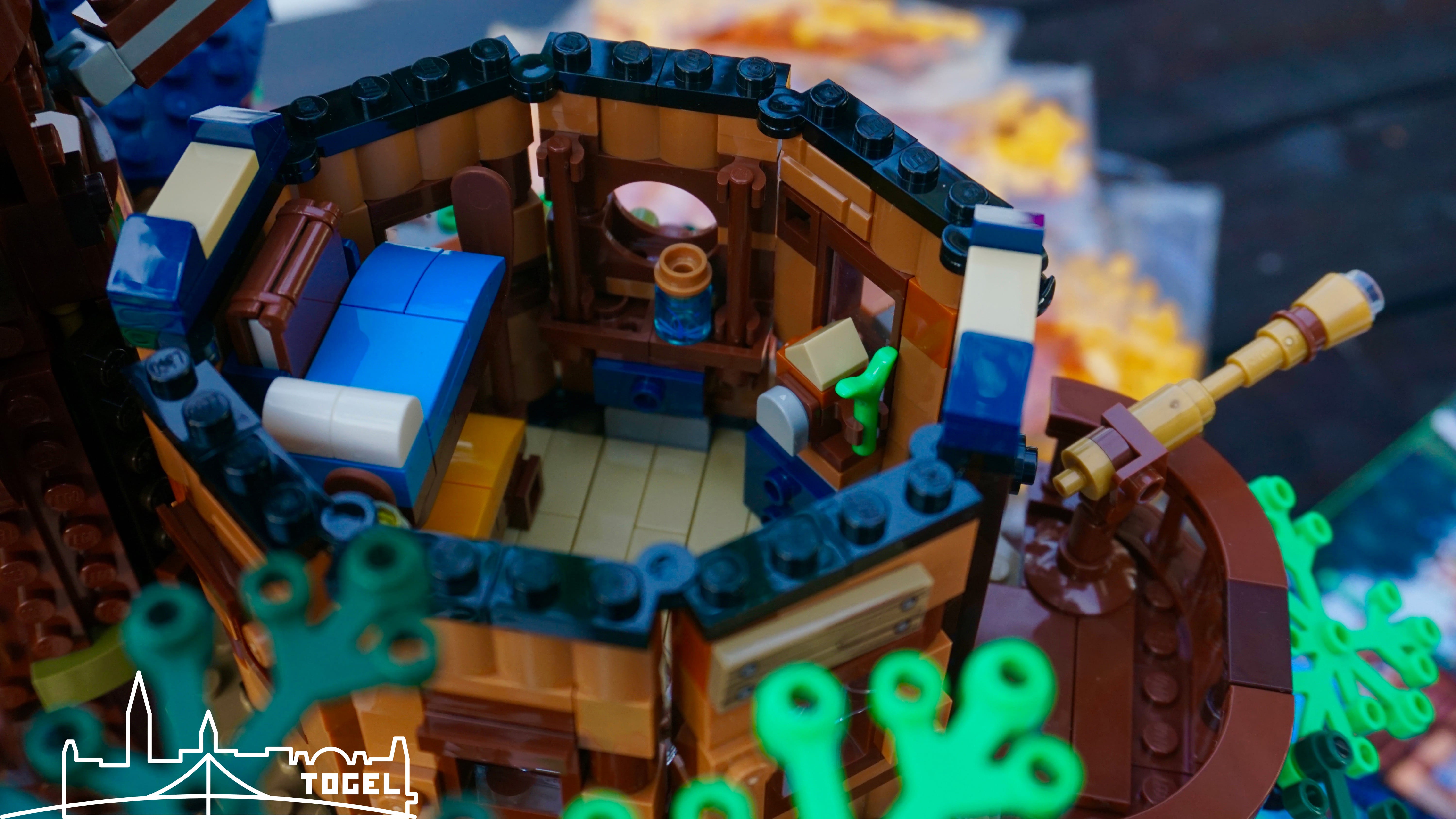Generell sind alle Hütten großartig eingerichtet und mit zahlreichen kleinen Details versehen. Da wundert man sich wie viel auf kleinem Platz möglich ist. Erforscht die Details selber beim Bauen oder analysiert meine Bilder ganz genau. Manchmal lohnt sich ein zweiter Blick. Die Dächer, sowie auch die Baumkrone sind zum Bespielen und Bestaunen einfach abnehmbar. Hierbei wurde jeder Dachverbindung eine Farbe zugewiesen, damit auch jedes Dach wieder seine rechtmäßige Stelle findet. Ein Flaschenzug befördert Lebensmittel nach unten zur Kochstelle.