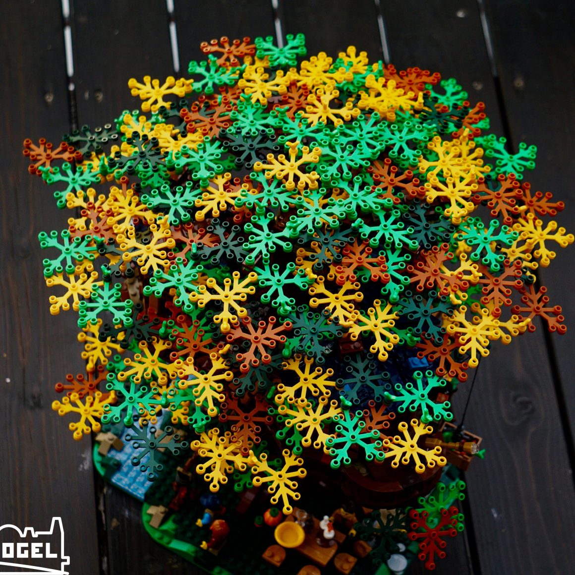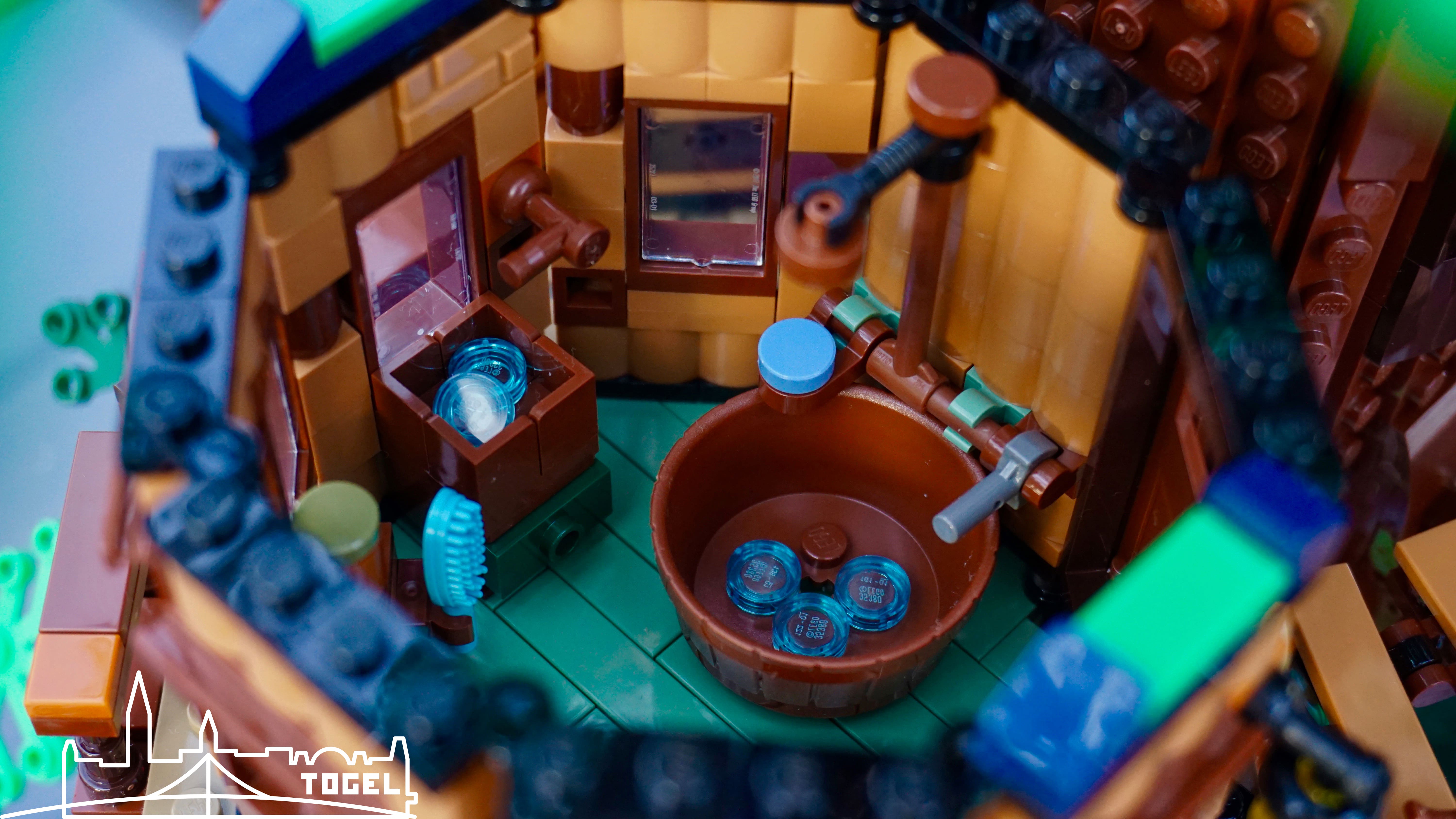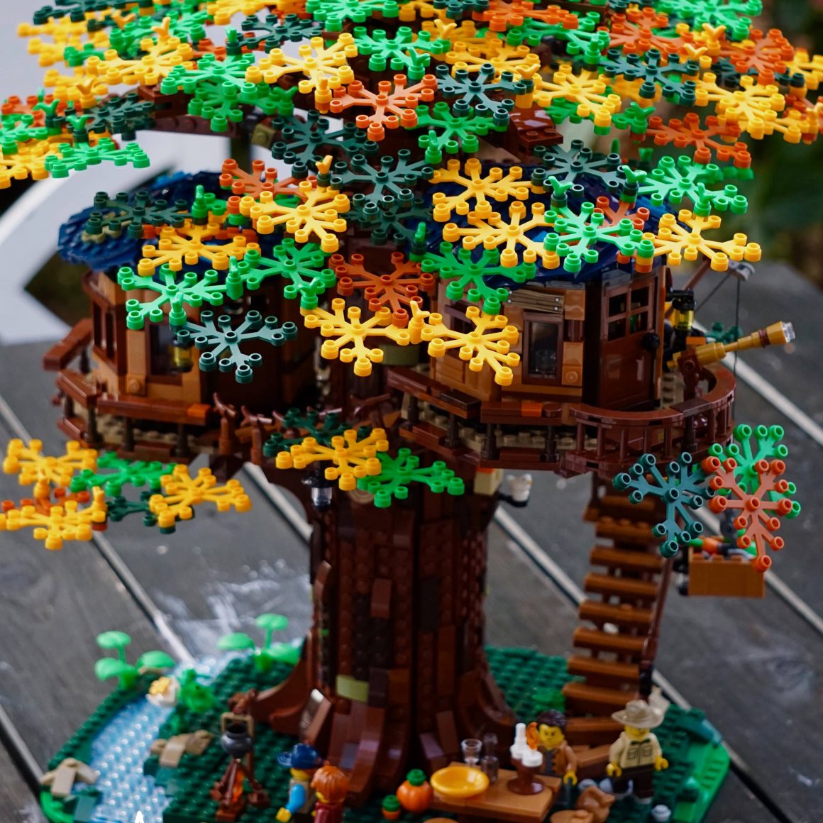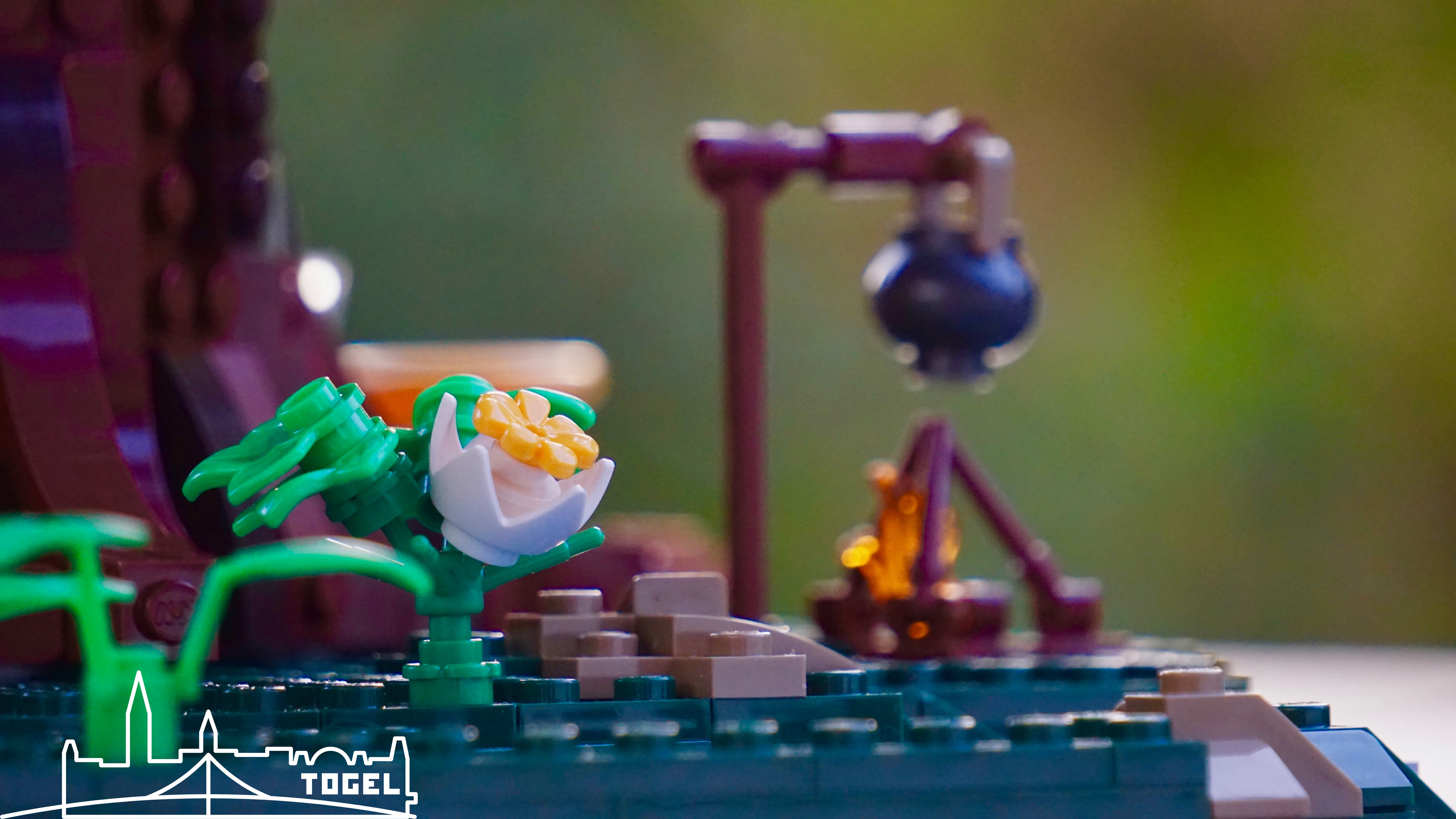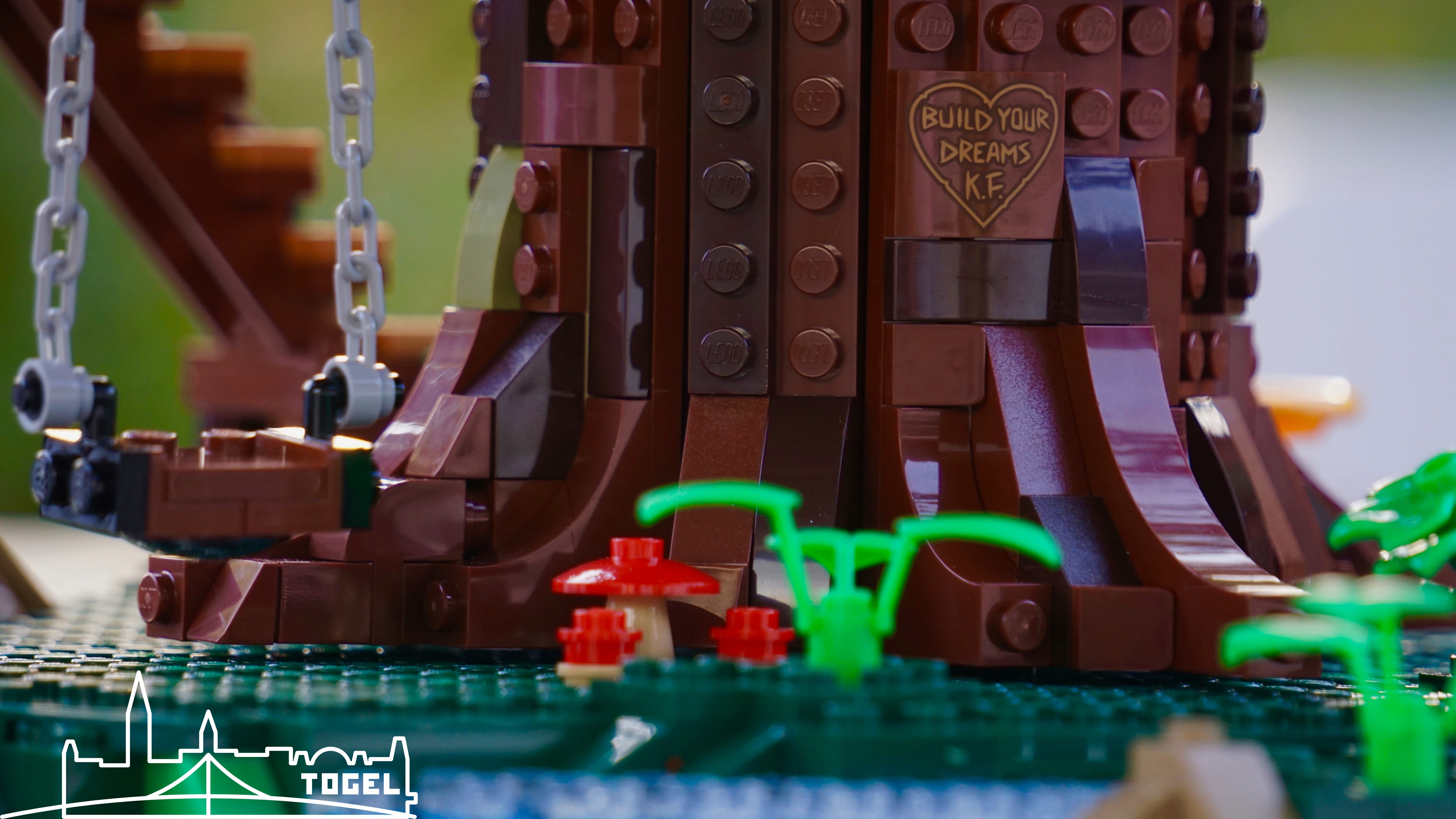 Der Boden ist durch die Baumkrone mit dunkelgrünem, schattigem Gras bedeckt. Am massiven Baumstamm befinden sich neben der Treppe zum Baumhaus, eine Feuerstelle, eine Schaukel, ein Esstisch und ein Bach zum Waschen. Rund um den Baumstamm gibt es viele kleine Details zu finden, wie ein Vogelhäuschen oder eine Botschaft des Fan Designers im Baumstamm. Besonders positiv ist, dass dem Set kein Stickerbogen beiliegt und demnach alle Steine bedruckt sind.