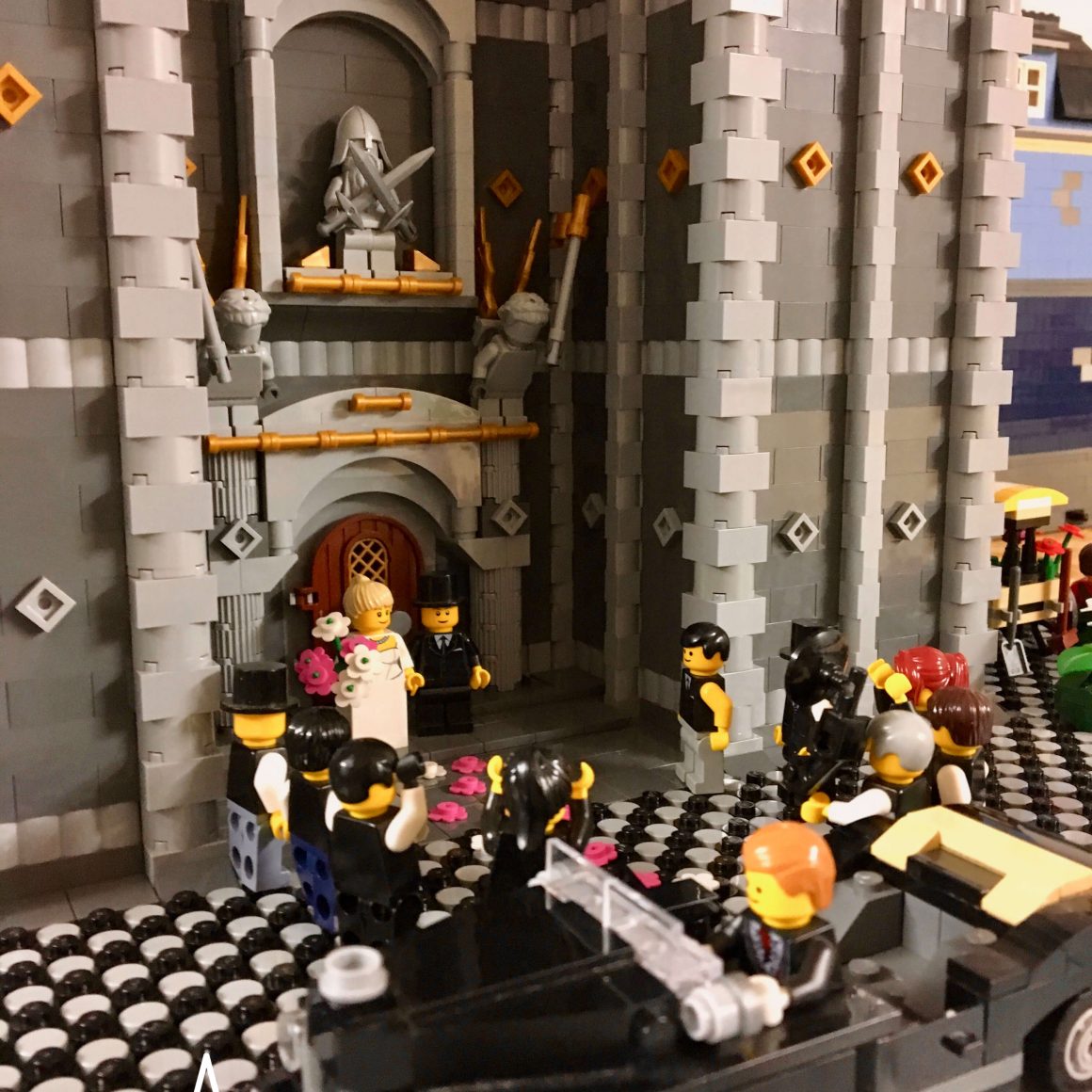 Kaum steht die Lego Kathedrale in ihrer vollen Pracht, findet schon die erste Hochzeit statt. Standesgemäß wird das Brautpaar vor dem Eingang von der Gesellschaft mit Blumen und einem Oldtimer empfangen.