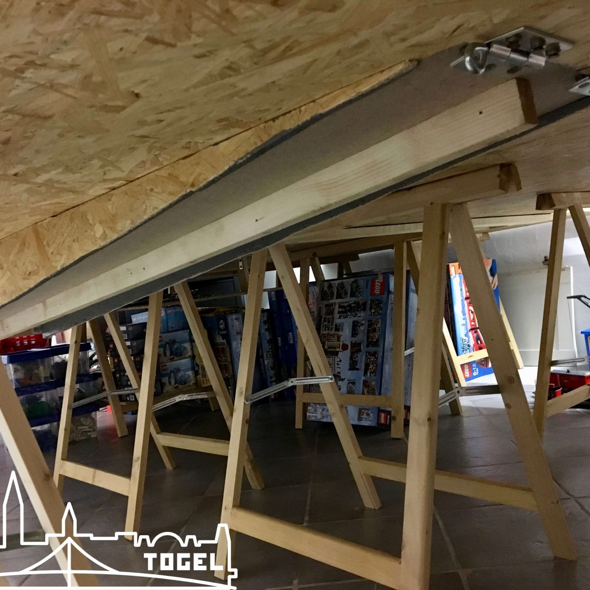 Das Projekt hat allerdings nicht nur den Zweck das platzeinnehmende Schienennetz teilweise auszulagern. Es kam immer mal wieder die Frage auf, wie ich den die Mitte dieses großen Layouts erreichen würde und zugegeben, manchmal habe ich mich das auch selber gefragt! Ab jetzt habe ich (bei gleichbleibender Schlankheit) eine bequeme Antwort auf diese Frage. Die viergleisige Schienenrampe kann nämlich durch abnehmbare Klavierscharniere mühelos ausgeklinkt werden. Die Schienen sollten nur vorher oben und unten getrennt werden.